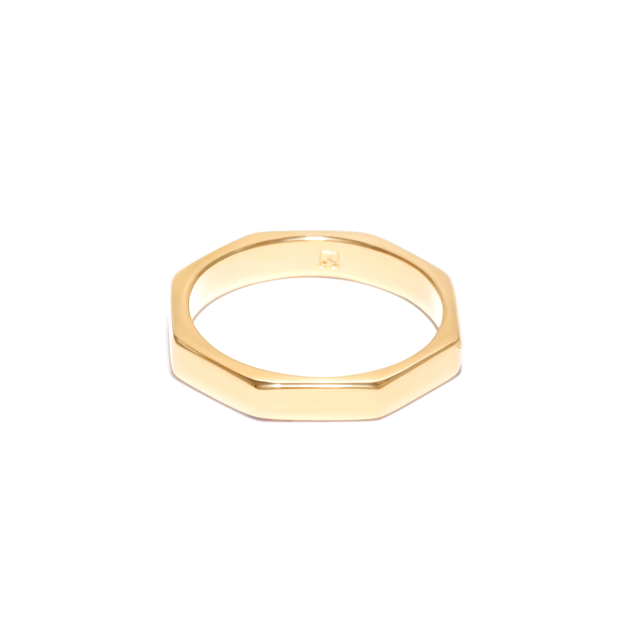 Gold-plated ring with a polygonal shape and smooth surface. A clean design highlights modern minimalism.