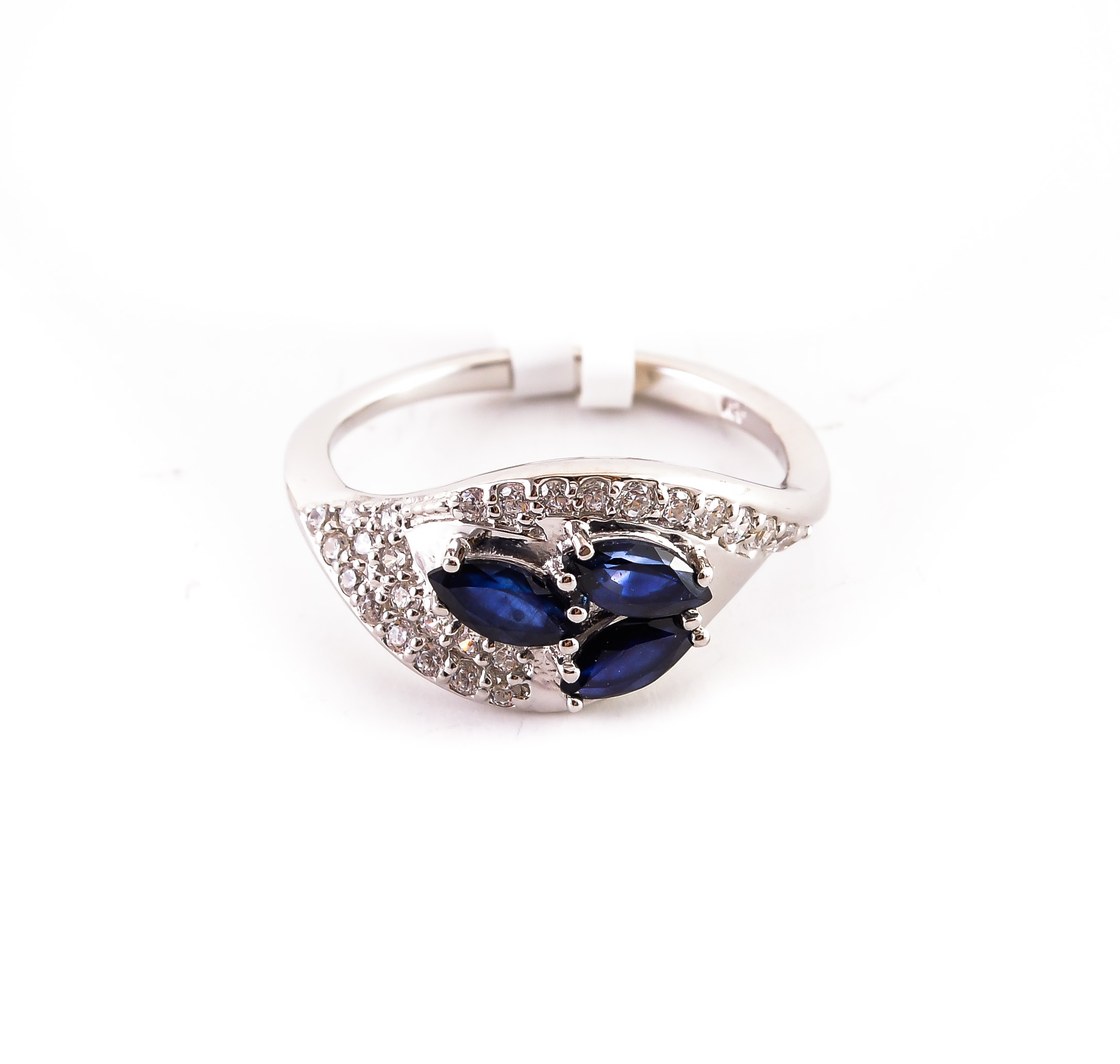 Petal shaped sterling silver ring, showcasing deep blue oval cut sapphires resting in the glistening cubic zirconia set background. The product comes with the Assay Office of Latvia quality certificate.