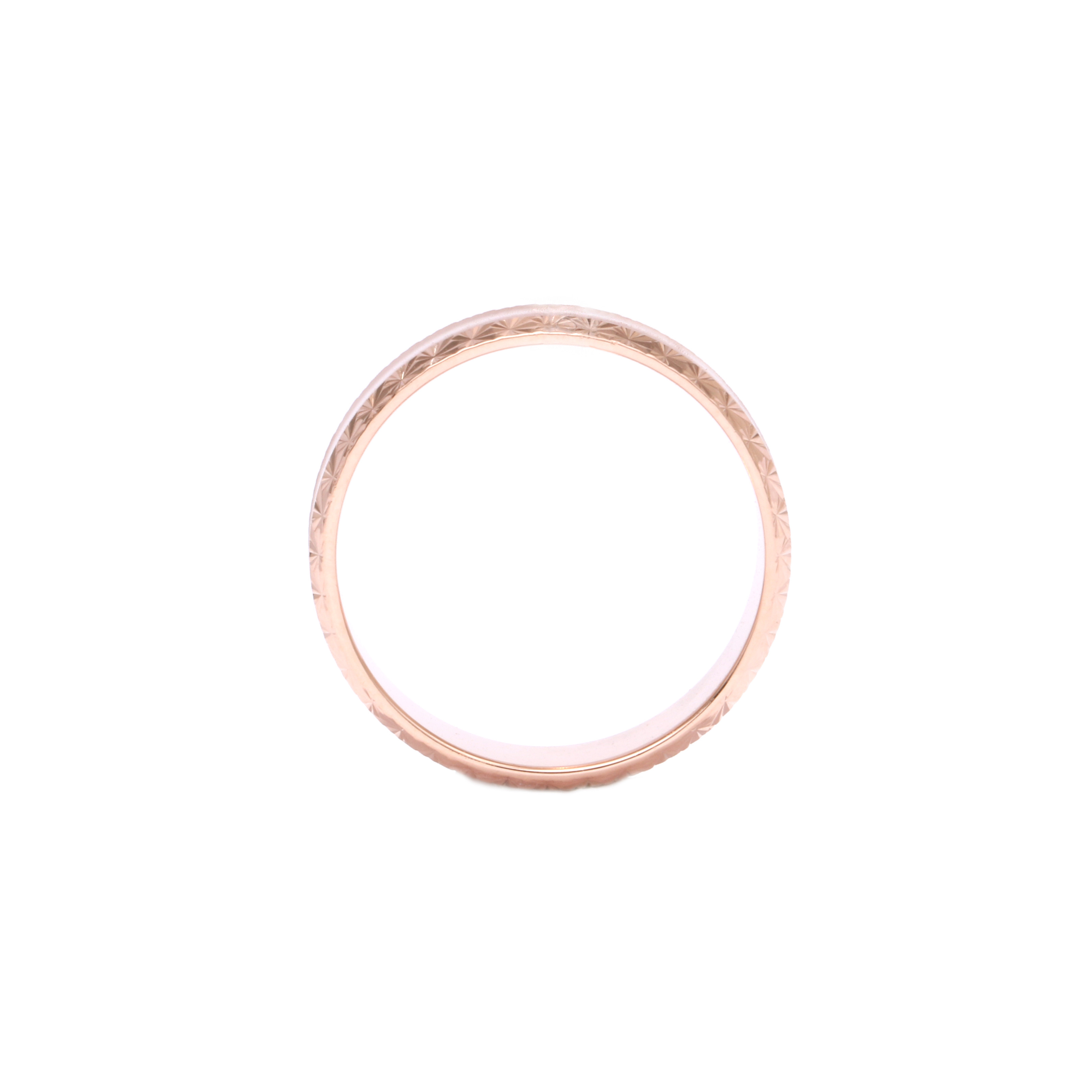 Punasest kullast abielusõrmus, tekstuurse pinnaga , matti efekti saavutamiseks. Sõrmuse ääred säravad tänu teemantlihvile.