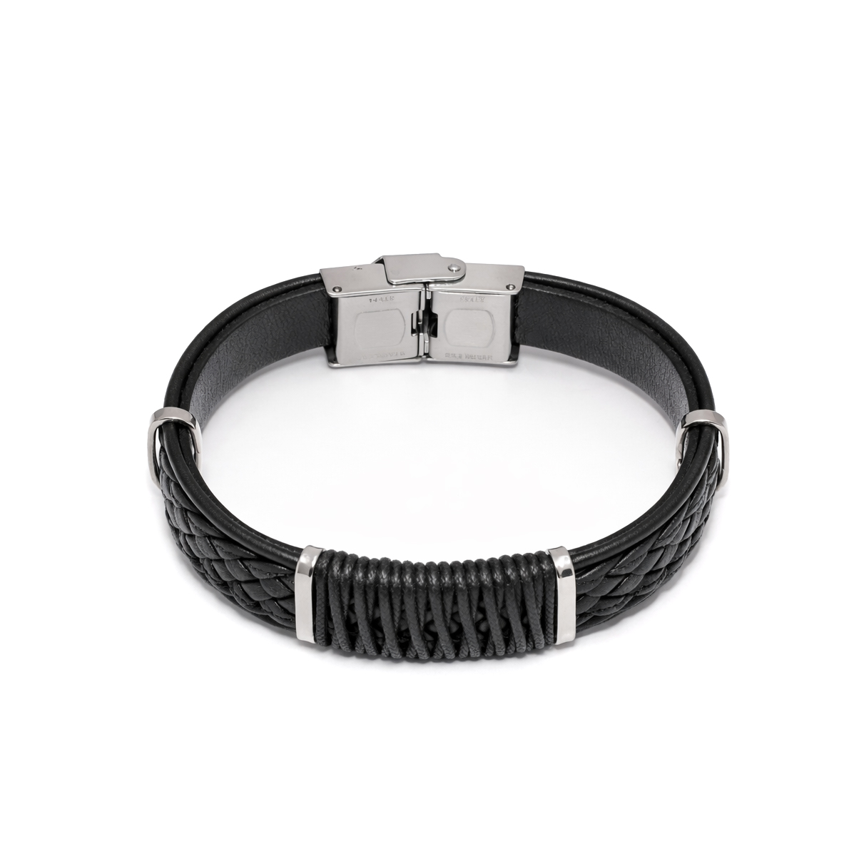 A stainless steel bracelet with braided black leather and decorative accents. Durable and comfortable with a secure metal clasp.