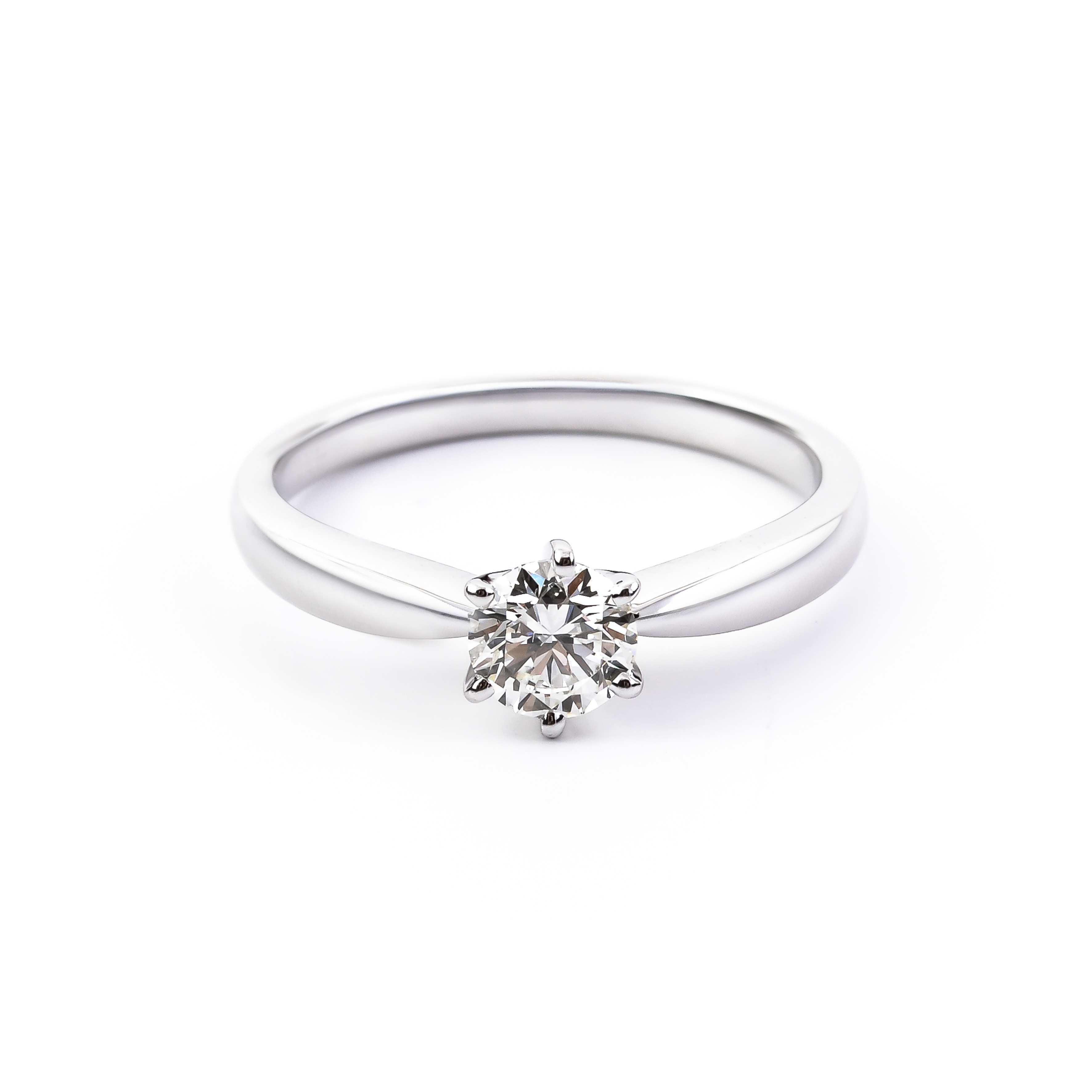 Since the ancient times, there is no better symbol of a love confession than an engagement ring.  This yellow (white, red) gold ring with a single diamond, a glaringly pure and adamant gem of classical round cut, fastened with six prongs, epitomizes the heavenly beauty of such an important event as engagement. The product comes with the Assay Office of Latvia quality certificate.