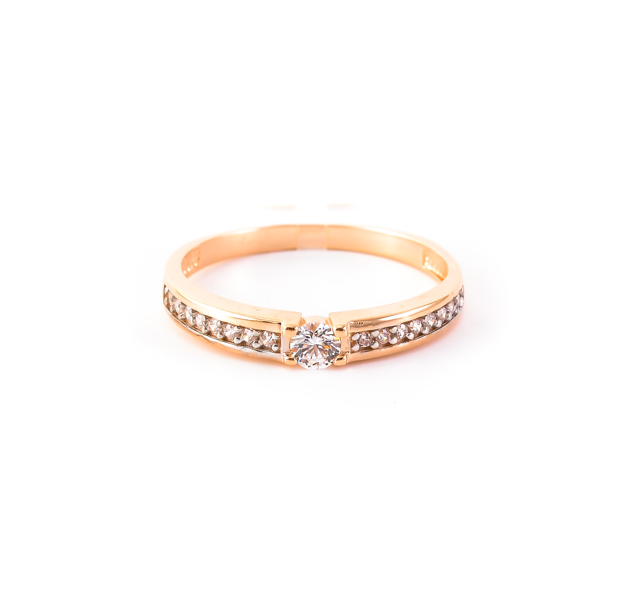 Charming slender ring, crafted out of red gold. The main cubic zirconia is complemented with dazzling shoulders, to make sure you sparkle from any angle.