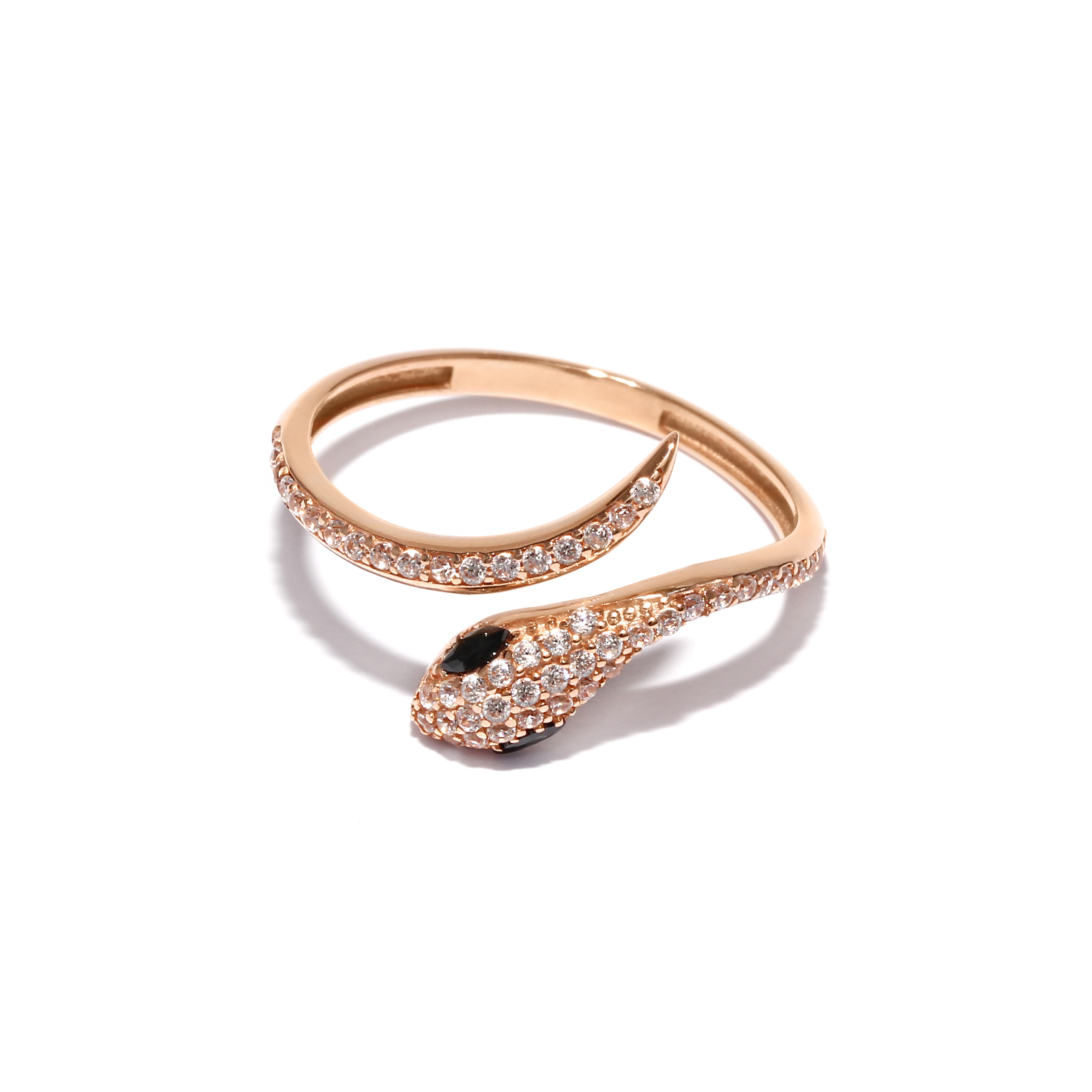 Gold ring designed in the shape of a snake, adorned with sparkling white and black cubic zirconia.